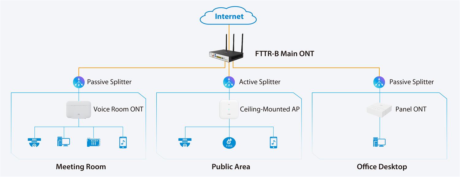 Integrated service transport, simplified equipment, easy to install. Space occupation in the weak-current room reduced by 80%, power consumption reduced by 30%. Photoelectric composite cables + POF AP, remote power supply, flexible deployment.